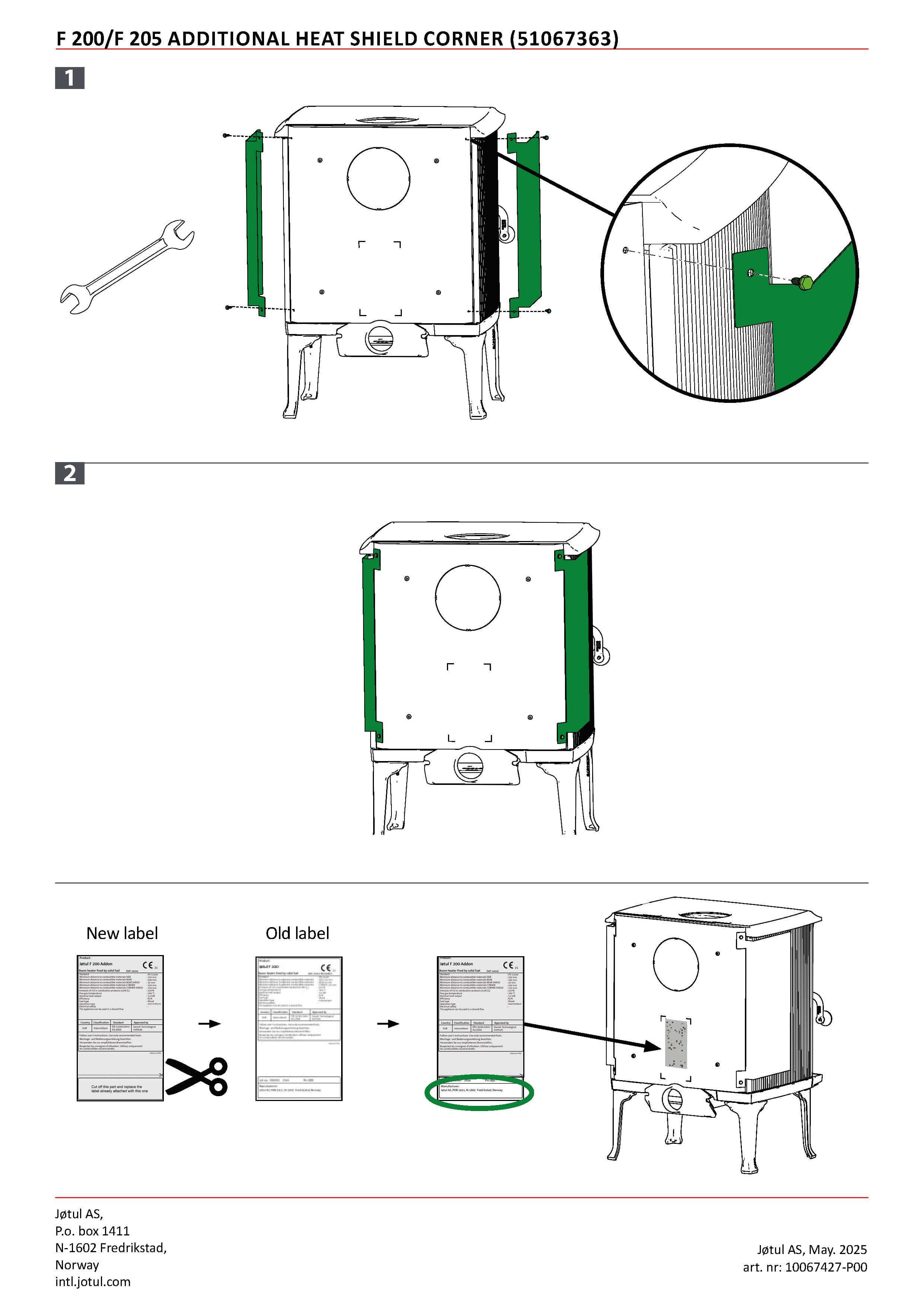 ✅ De nya produktionsmodellerna, Jøtul F 200 V2 / F 205 V2, har ett uppdaterat värmesköld och nya avstånd för placering mot brännbar vägg.