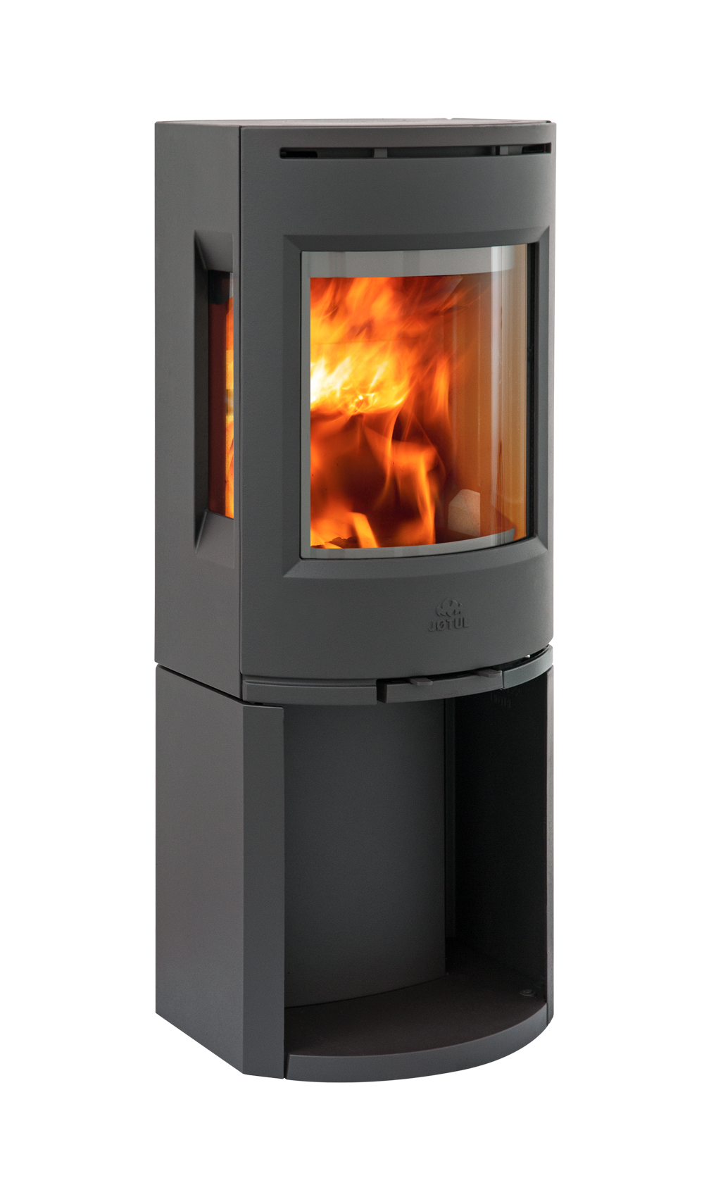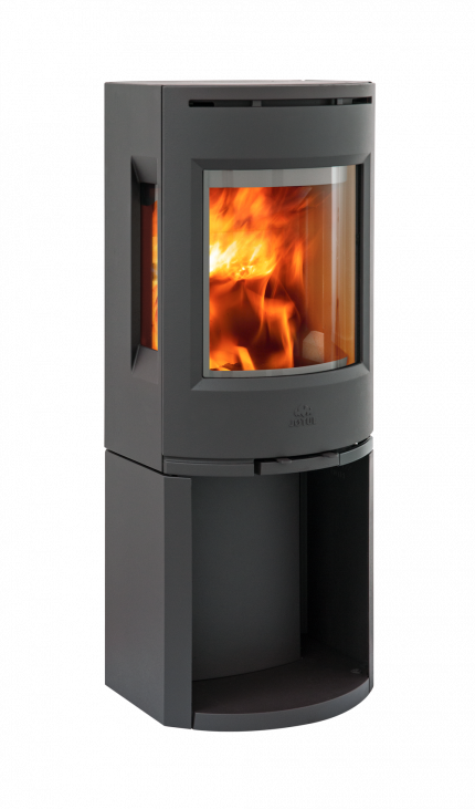 Jøtul F 130-serien är en modern, hög och stilren braskamin. För hus med lågt energibehov är den här braskaminen ett idealiskt alternativ. Den är kompakt och utvecklad för att fungera optimalt på låg effekt. Du kommer att uppskatta både de fina värmeegenskaperna och att du ser så mycket av elden genom det rena glaset. F 130-serien är renbrännande med ett modernt förbränningssystem som effektivt renar röken från partiklar och gör den mer effektiv, vilket minskar vedförbrukningen med upp till 40 procent. Integrerad konvektion gör att den kan installeras nära brännbart material. Ytan i svart matt lack ger F 130-serien ett stilrent formuttryck. Välj mellan sockel eller pelare och med eller utan sidoglas. Bakom den här kaminserien står den prisbelönta designbyrån Hareide Design. Jøtul F 135 är en kamin med sidoglas och sockel. Den kan placeras 10 cm från brännbart material bakom. På grund av sidoglasen behöver det vara 18 cm avstånd vid hörnplacering.