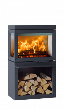 En stor braskamin med unik design som ger mycket värme. Denna braskamin har flera praktiska funktioner som gör den enkel att använda. Den har en stor och rymlig kokplatta som lämpar sig bra till matlagning med flera kastruller. Här kan du även varmhålla mat och dryck. Kaminen är försedd med tre stora glas som ger god insyn över lågorna från flera håll i rummet. Ytbehandling på alla glas och luftspolning bidrar till att hålla glasen renare. Användarvänliga luftventiler gör det enkelt att tända och elda och en brasbegränsare i brännkammaren och ett snäpplås i luckan gör eldandet tryggt och säkert.